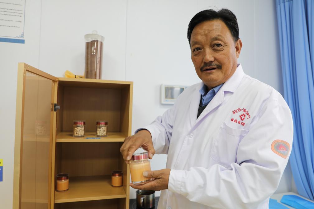 10月29日,甘南藏医药代表性传承人看照加展示藏医院制作的院内制剂。新华社记者梁军 摄