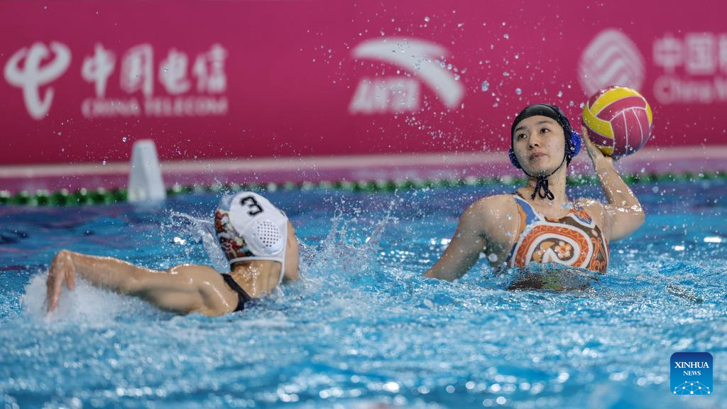 Wang Huan (R) of Shanghai competes during the women's water polo final between Shanghai and Tianjin at China's 15th National Games in Guangzhou, south China's Guangdong Province, Nov. 21, 2025. (Xinhua/Pan Yulong)