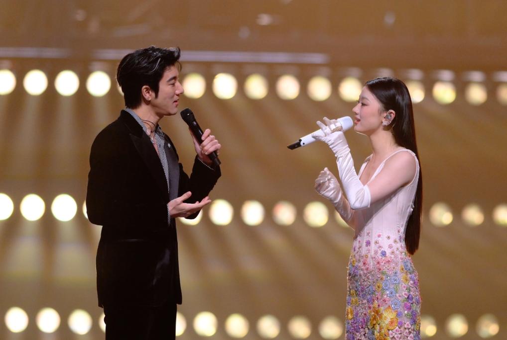 9月28日,王力宏(左)和单依纯在演唱《落叶归根》。新华社发(张金加摄)