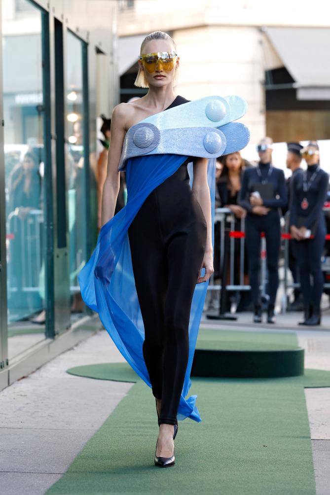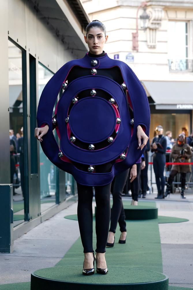 10月7日,模特在法国巴黎时装周上展示皮尔·卡丹品牌2026春夏新品成衣。