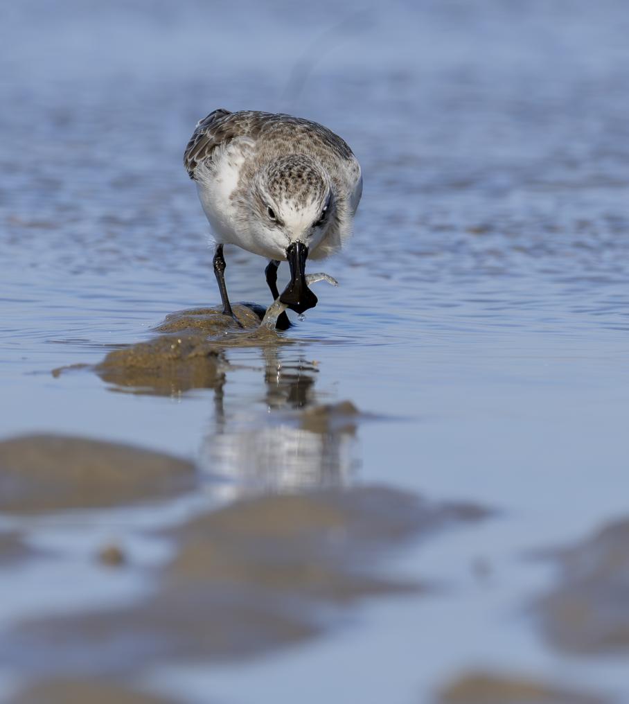 11月9日,一只勺嘴鹬在泉州围头湾滩涂上捕食海虾。