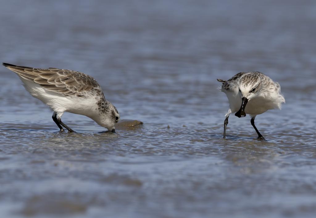 11月9日,两只勺嘴鹬在泉州围头湾滩涂上觅食。