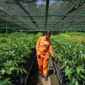 10月17日,在巴西亚马孙州的乌鲁库油气生产基地,一名工作人员在生态苗圃内检查幼苗生长情况。