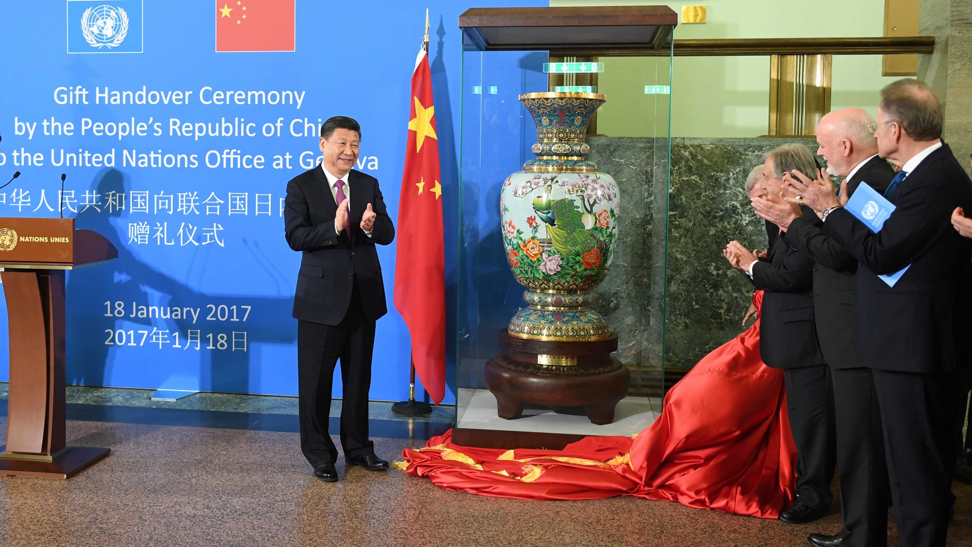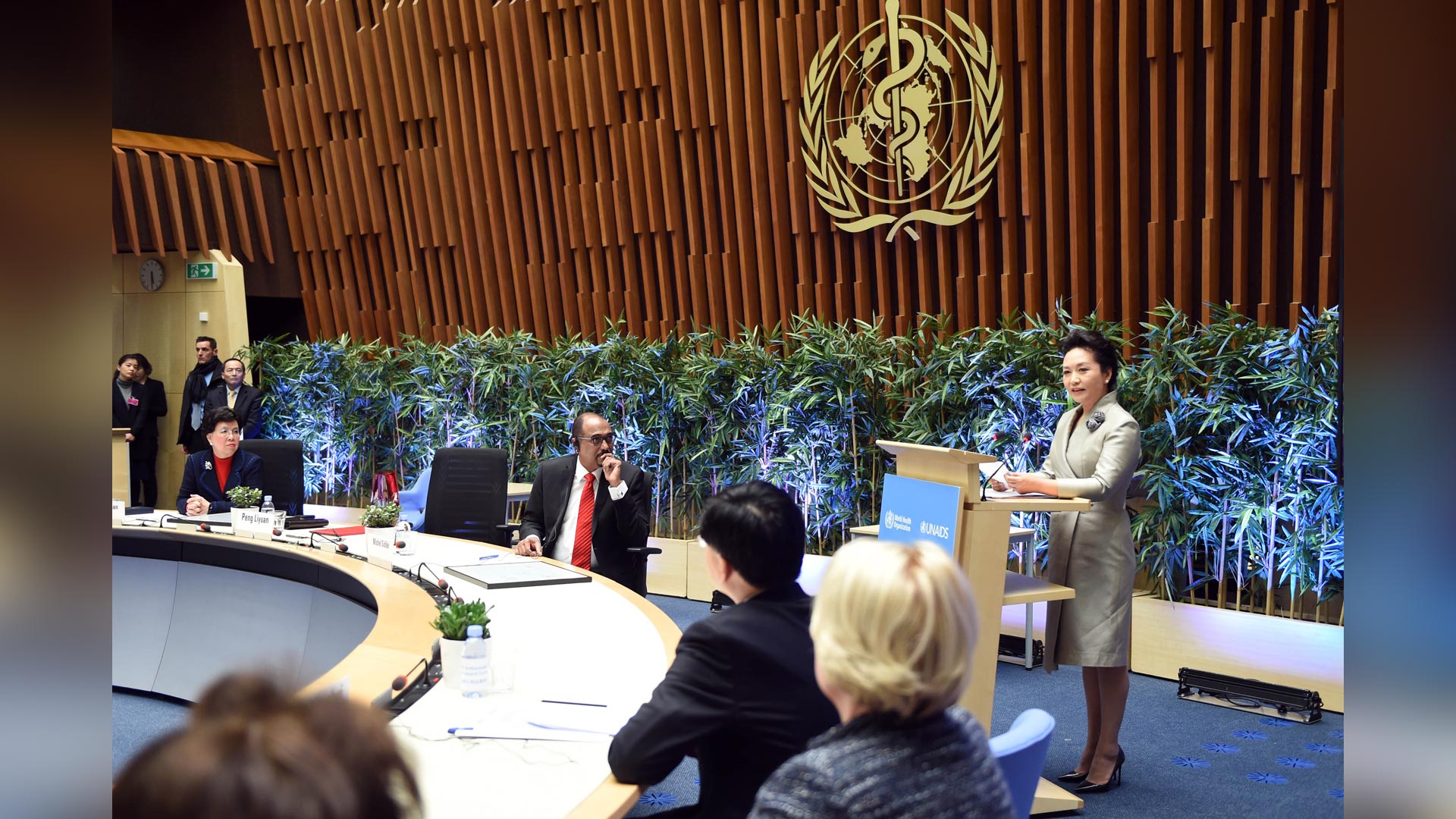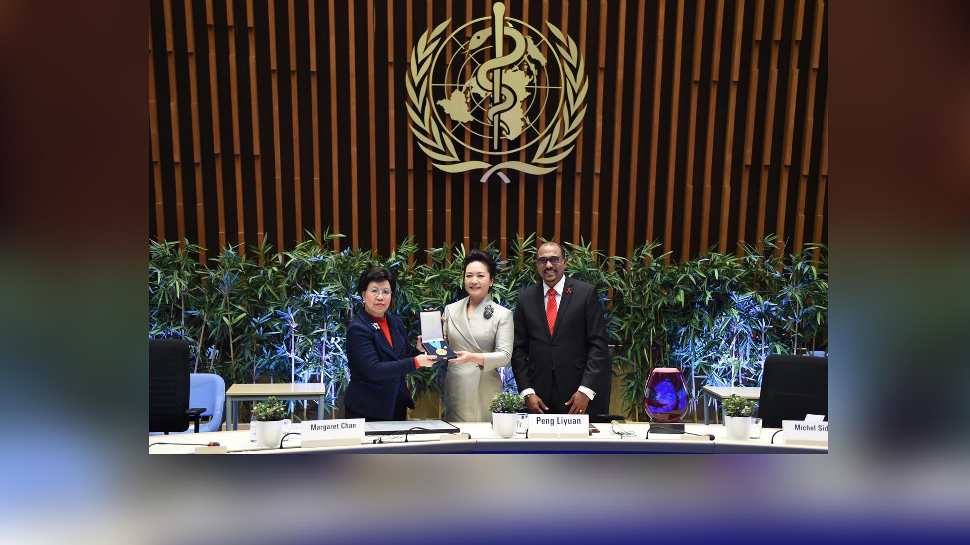 1月18日,國(guó)家主席習(xí)近平夫人、世界衛(wèi)生組織結(jié)核病和艾滋病防治親善大使彭麗媛應(yīng)世界衛(wèi)生組織總干事陳馮富珍和聯(lián)合國(guó)艾滋病規(guī)劃署執(zhí)行主任西迪貝邀請(qǐng),在瑞士日內(nèi)瓦出席為她舉行的親善大使任期續(xù)延暨頒獎(jiǎng)儀式。這是聯(lián)合國(guó)艾滋病規(guī)劃署執(zhí)行主任西迪貝向彭麗媛頒發(fā)艾滋病防治“杰出成就獎(jiǎng)”獲獎(jiǎng)證書。新華社記者謝環(huán)馳攝2017-01-19